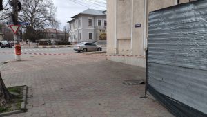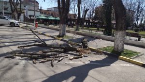 Circulaţia se desfăşoară cu dificultate în proximitatea parcului central din Tecuci, pe strada Republicii, după ce mai multe bucăţi dintr-un acoperiş aflat în construcţii s-au desprins şi au căzut pe o alee pietonala.