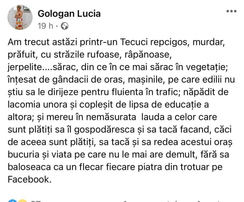 “Am trecut astăzi printr-un Tecuci repcigos, murdar, prăfuit, cu străzile rufoase, râpănoase, jerpelite….sărac, din ce în ce mai sărac în vegetație; înțesat de gândacii de oras, mașinile, pe care edilii nu știu sa le dirijeze pentru fluienta în trafic; năpădit de lacomia unora și copleșit de lipsa de educație a altora; și mereu în nemăsurata lauda a celor care sunt plătiți sa îl gospodăresca și sa tacă facand, căci de aceea sunt plătiți, sa tacă și sa redea acestui oraș bucuria și viata pe care nu le mai are demult, fără sa baloseaca ca un flecar fiecare piatra din trotuar pe Facebook.”