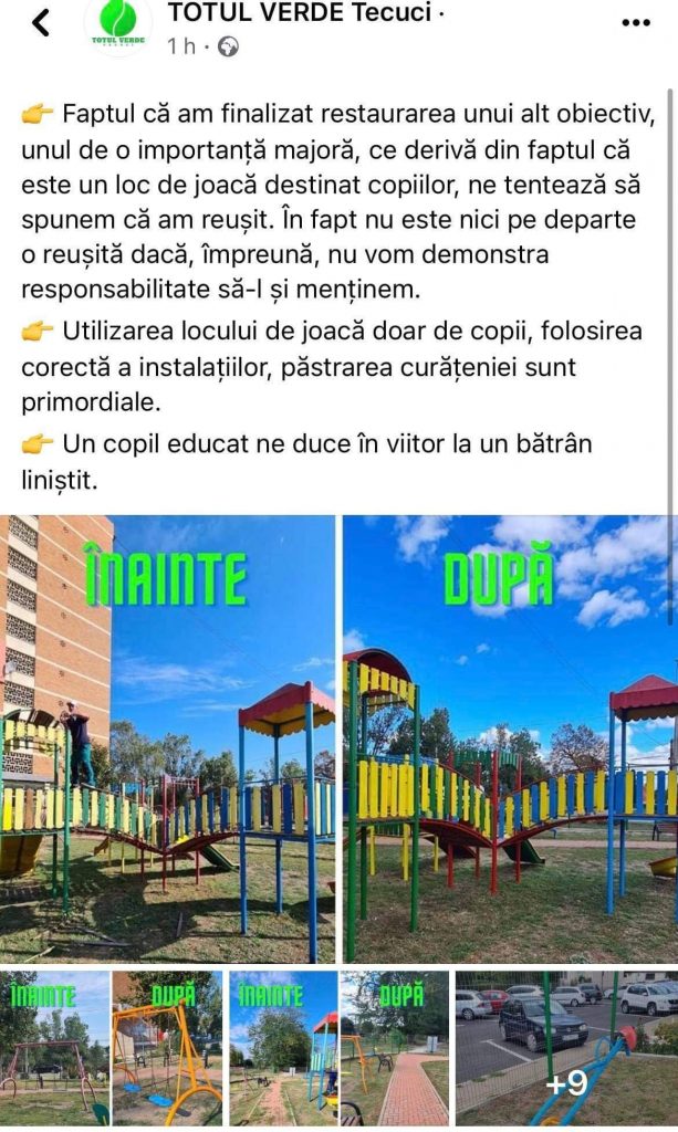 Direcția din Primărie condusă și împânzită de peneliști, TOTUL VERDE Tecuci, se laudă cu “recondiționarea” superficială a unor elemente ale unui loc de joacă, când de fapt, marile problemele ale orașului nu sunt rezolvate.