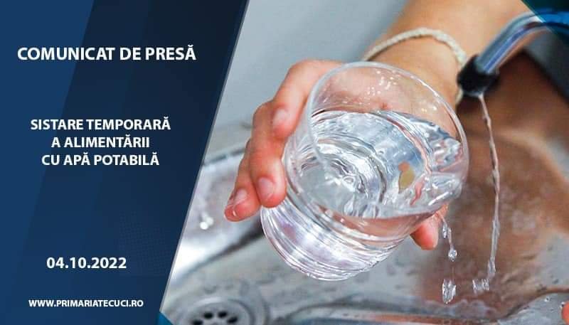 Primăria Municipiul Tecuci vă aduce la cunoștință faptul că în data de 04 octombrie 2022 între orele 9:00 – 14:00 se va întrerupe furnizarea cu apă potabilă în municipiul Tecuci pentru utilizatorii casnici / ag economici din cadrul Asociației de proprietari nr 9, 9A, 9b, ANL Primărie – Cartier CFR pentru executarea unor lucrări în rețeaua de distribuție a apei potabile str 1 Decembrie 1918 c/c str Matei Basarab.