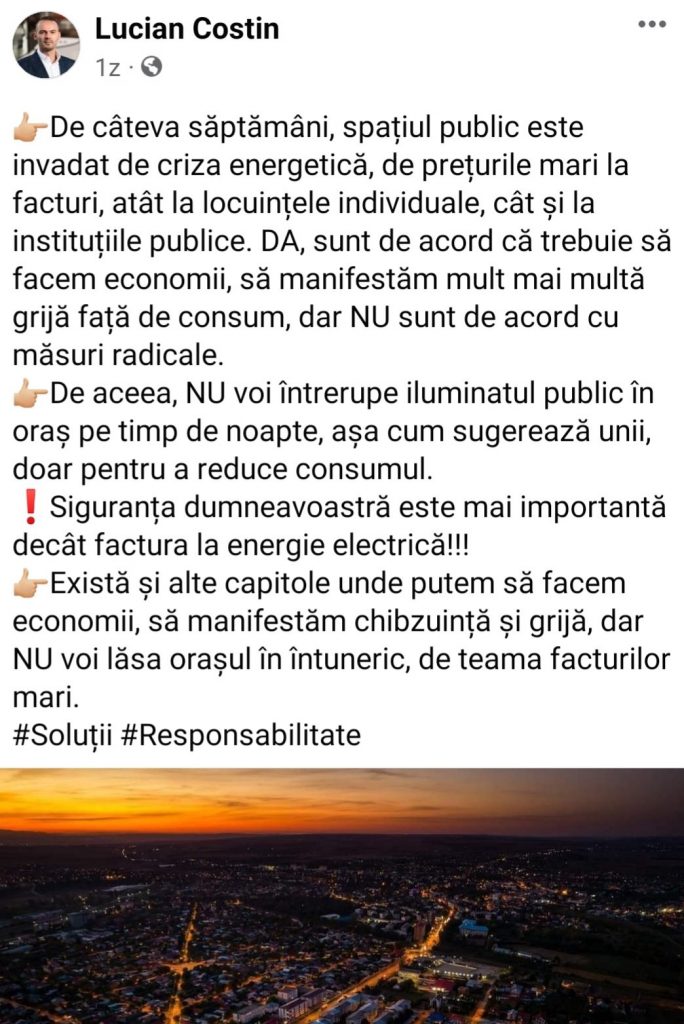 Primarul Lucian Costin a ieșit cu o postare pe o rețea se socializare, unde specifica că nu stinge becurile din oraș, pentru siguranța tecucenilor. Nimic neobișnuit până aici.