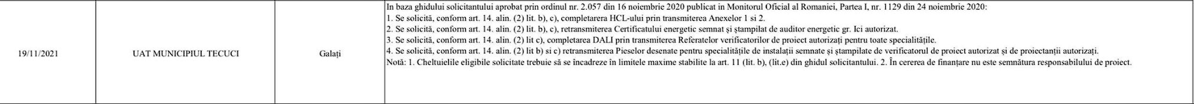 Consultați lista “Centralizatorul proiectelor ale căror dosare necesită completări/remedieri/clarificări”: https://www.afm.ro/main/programe/eficienta_energetica/2022/eficienta_energetica_cladiri_publice-cereri_propuse_clarificare-2022_11_01.pdf