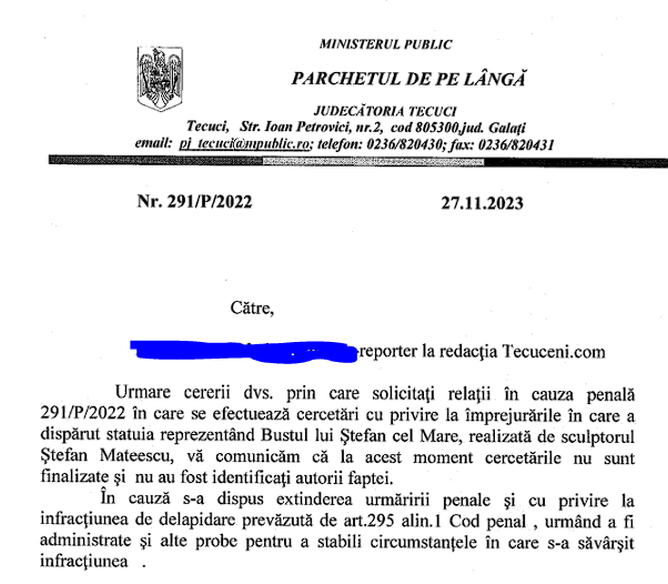 Parchetul de lângă Judecătoria Tecuci a dispus extinderea urmăririi penale și pentru infracțiunea de delapidare, urmând să fie administrate și alte probe pentru a se stabili circumstanțele în care s-a săvârșit infracțiunea, se arată într-un răspuns dat de Parchetul de pe lângă Judecătoria Tecuci către redacția Tecuceni.