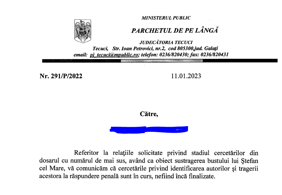 Dar care hoți? După mai bine de un an de zile, dosarul penal pentru furt este încă în lucru, iar până la acest moment identificarea autorilor și tragerea lor la răspundere este în curs, transmite Parchetul de pe Lângă Judecătoria Tecuci.