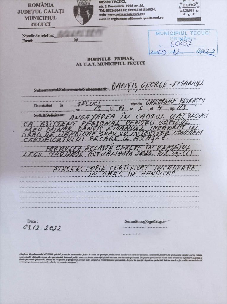 La începutul lunii decembrie 2022, tatăl unui băiat diagnosticat cu handicap, a depus o solicitare la Primăria Tecuci pentru a putea fi încadrat ca însoțitor.