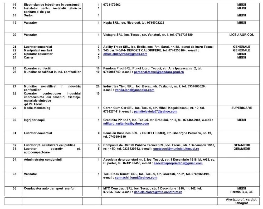 Agenția Locală pentru Ocuparea Forței de Muncă Tecuci a transmis astăzi lista locurilor de muncă disponibile în Municipiul Tecuci și împrejurimi.