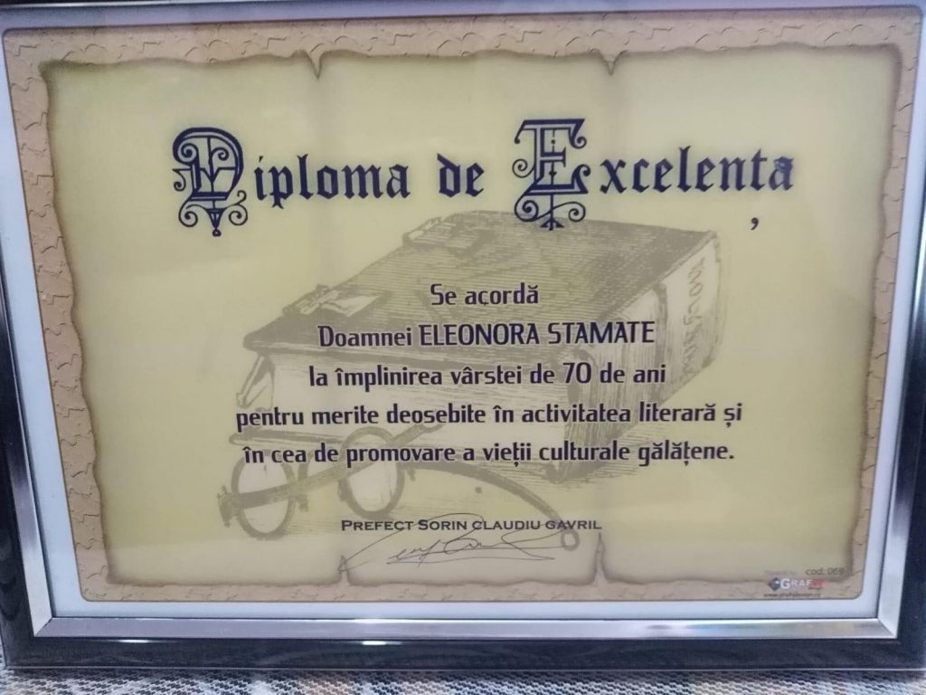 O citesc și eu cu mare atenție – DIPLOMĂ DE EXCELENȚĂ. ,,Se acordă doamnei Eleonora Stamate, la împlinirea vârstei de 70 de ani, pentru merite deosebite în activitatea literară și în cea de promovare a vieții culturale gălățene”.