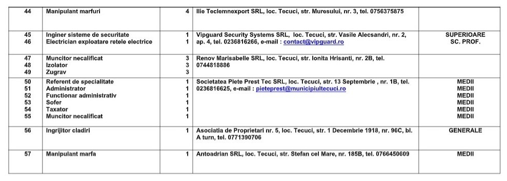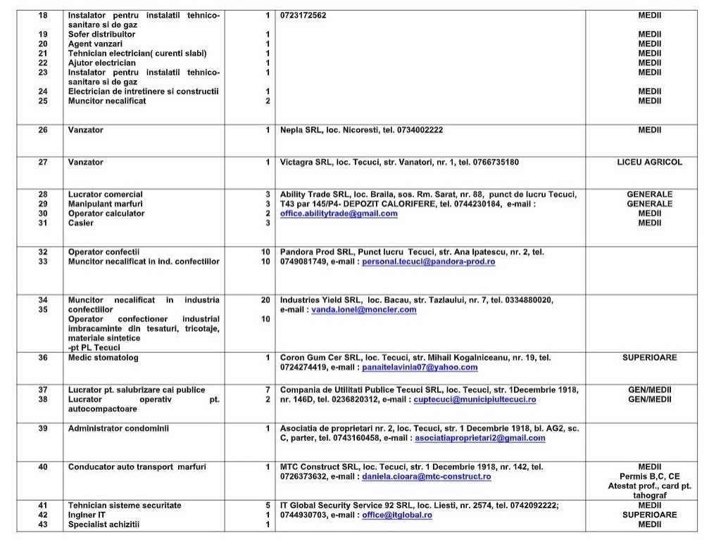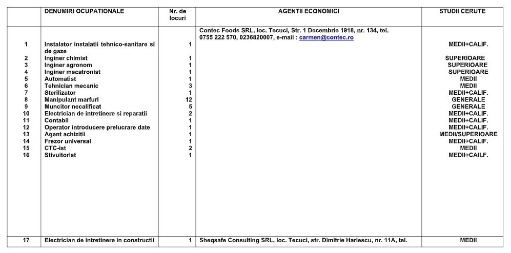 Persoanele interesate pot apela numerele înscrise în tabel sau pot cere informații suplimentare la ALOFM Tecuci, la tel. 0236.820.398.
