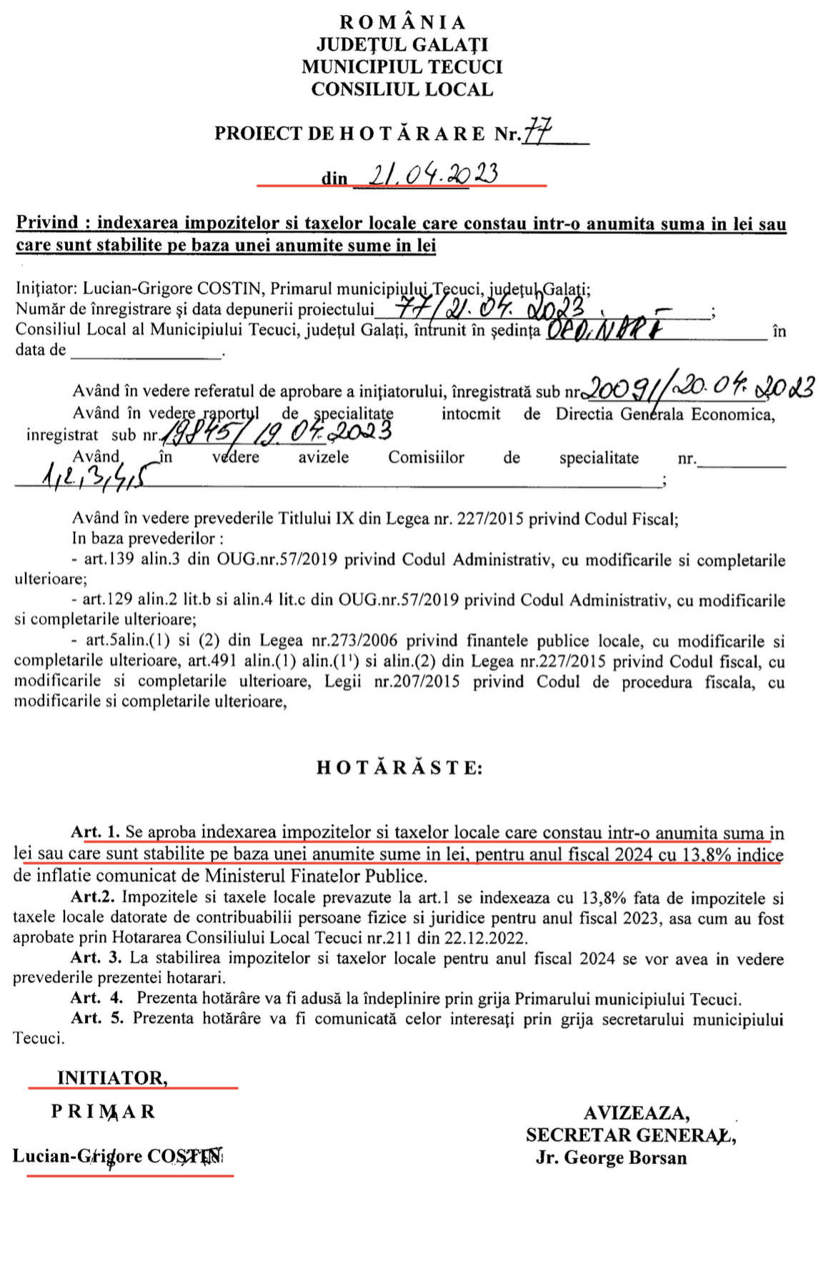 În ședința Consiliului Local Tecuci din data de 27.04.2023, pe ordinea de zi a fost aprobat un proiect de hotărâre care prevede mărirea taxelor și impozitelor locale cu 13,8%, acesta fiind inițiat de către Primar. (a se vedea aici)