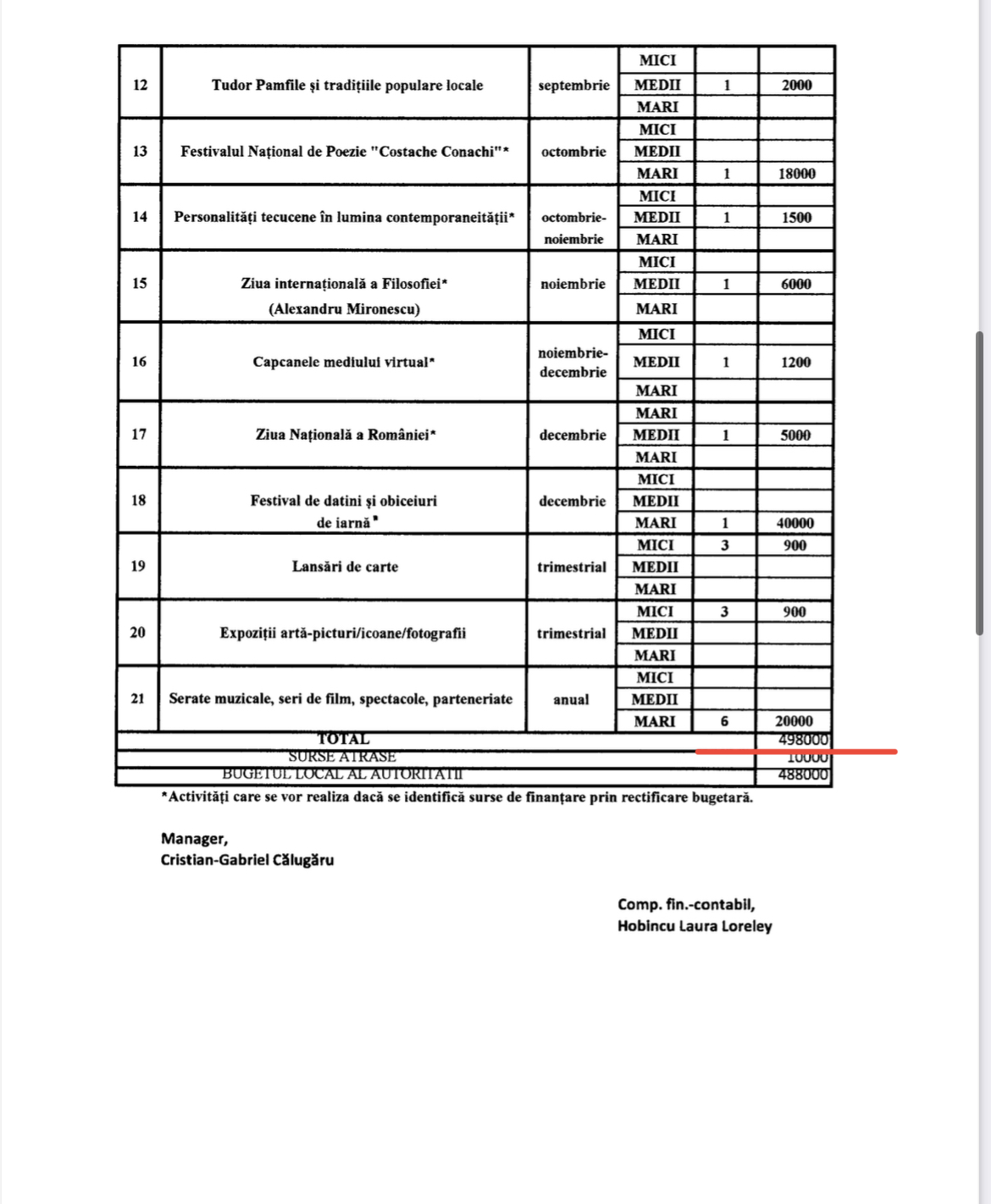 Valoarea totală a “activităților culturale” este, conform documentelor aprobate, de aproximativ 498.000 LEI (cca. 100.000€), cam cât două apartamente în Tecuci.
