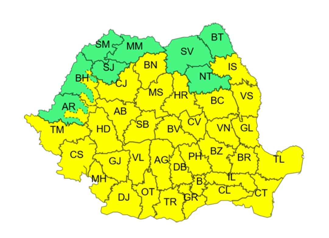 În interval de valabilitate 27 mai, ora 12 – 27 mai, ora 23, aproape toate județele din țară se vor afla sub cod galben de instabilitate atmosferică.
