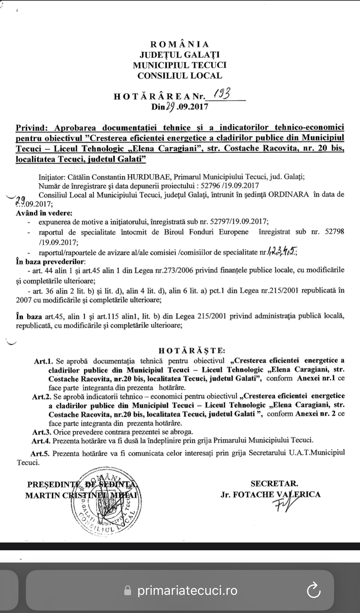 Conform documentelor de mai jos, reiese faptul că încă din anul 2017, administrația PSD a propus și aprobat în Consiliul Local Tecuci proiectul de Hotărâre nr.193/29.09.2017 privind aprobarea documentatiei tehnice si a indicatorilor tehnico-economici pentru obiectivul Cresterea eficientei energetice a cladirilor publice din Municipiul Tecuci – Liceul Tehnologic Elena Caragiani, str. Costache Racovita nr. 20 bis, localitatea Tecuci, judetul Galati.