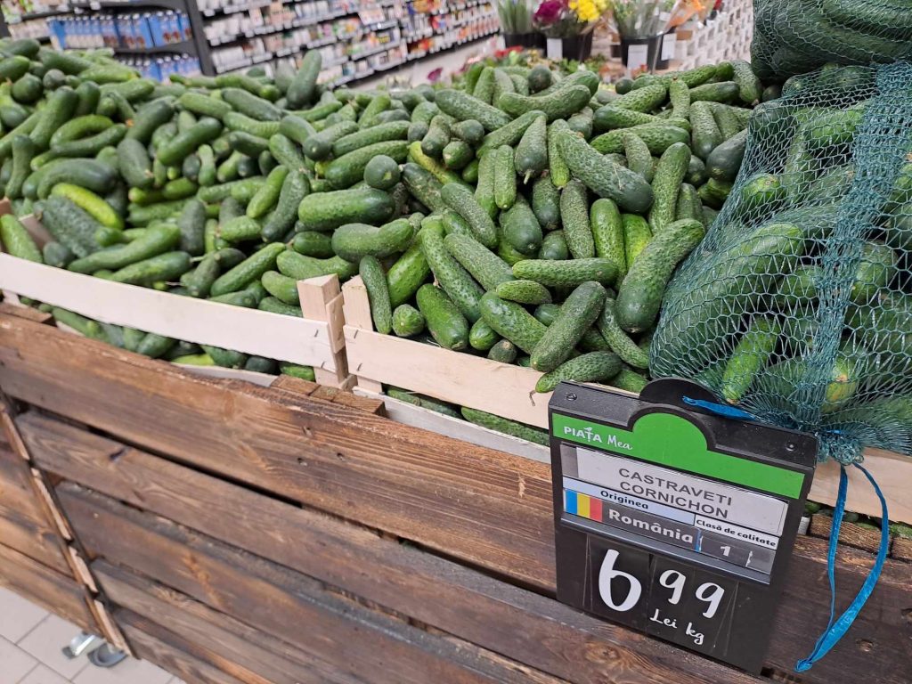 Un kilogram de castraveți se poate achiziționa de la raft cu 6.99 lei, în timp ce în piața locală din comună, prețul ajunge la circa 4 lei/kg.