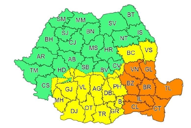 În intervalul menționat în județele Vrancea, Galați, Buzău, Brăila, Ialomița, Călărași, Tulcea și Constanța va ninge și va fi viscol. Vântul va avea intensificări susținute cu rafale de 75…85 km/h, iar vizibilitatea va scădea sub 50 m.