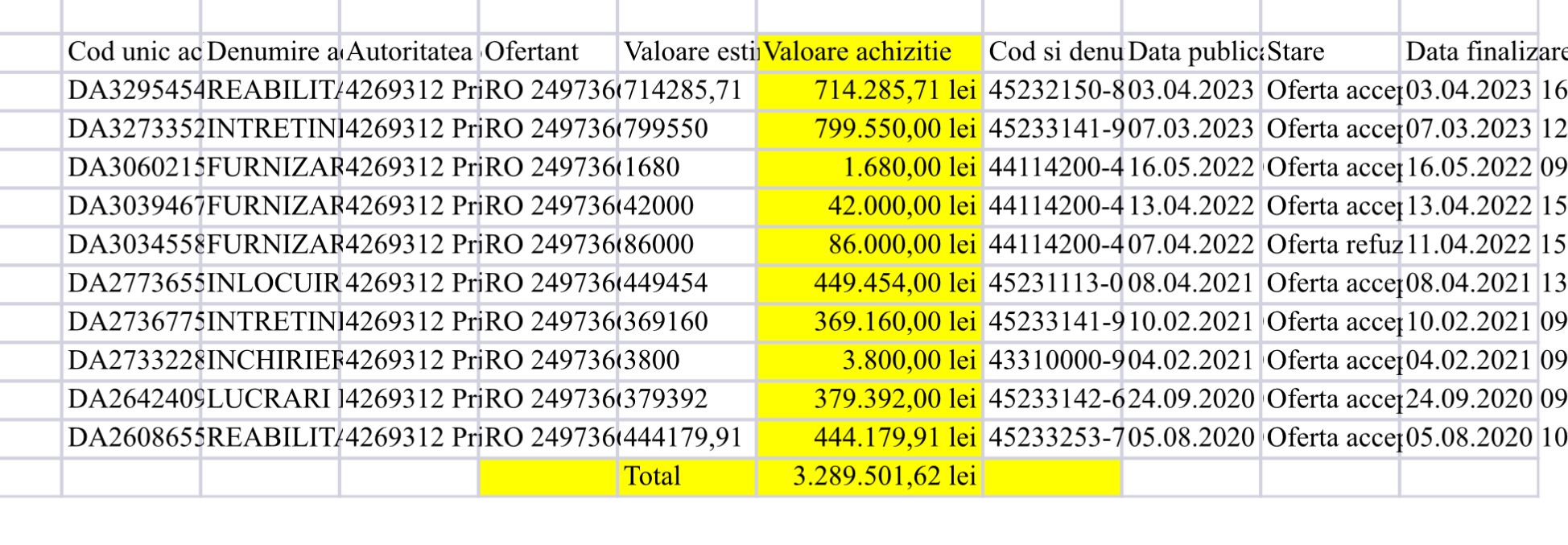 Valoarea totală a achizițiilor directe către BRIALBET SRL din partea Primăriei Tecuci însumează 3.289.501,62 lei (600.000€)