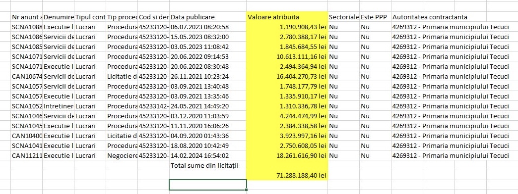 Valoarea totală a licitațiilor atribuite către BRIALBET SRL din partea Primăriei Tecuci însumează 71.288.188,40 lei (14.500.000€)