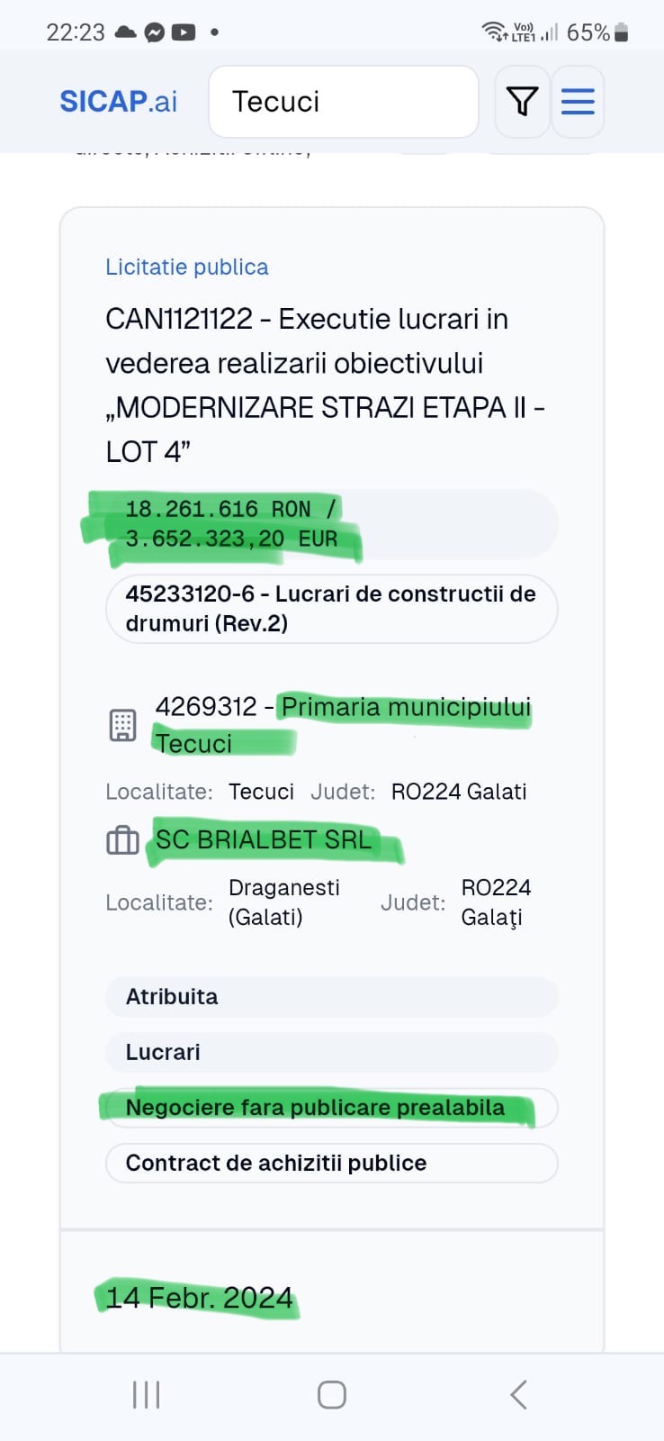 A fost atribuit prin negociere fără publicitate prealabilă, direct firmei BRIALBET SRL, CEL MAI MARE contract în valoare de 18.261.616 lei (3,6 milioane euro), de reparare a unor străzi din Tecuci. (