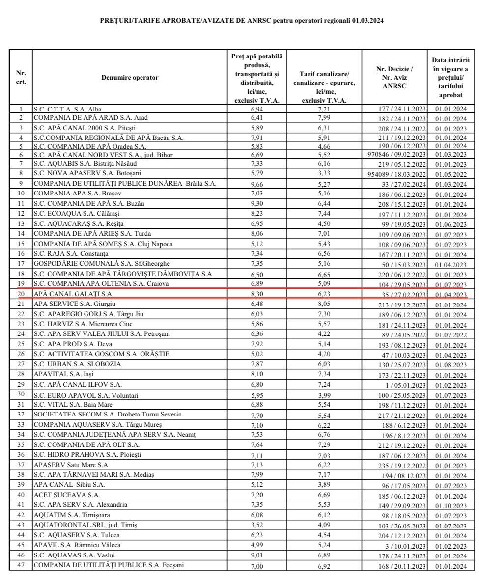 Datele Autorității Naționale de Reglementare pentru Serviciile Comunitare de Utilități Publice (ANRSC) arată negru pe alb care sunt, de fapt, tarifele la apă și canalizare în orașele din țară. Practic, din acest punct de vedere, județul Galați se situează abia pe locul 5, cu precizarea că cel mai mare tarif pentru apă potabilă este în județul Brăila (9,66 LEI/MC). Totodată, județul Galați se află pe locul 8 la prețul total al apei furnizate și canalizării inclusiv TVA.