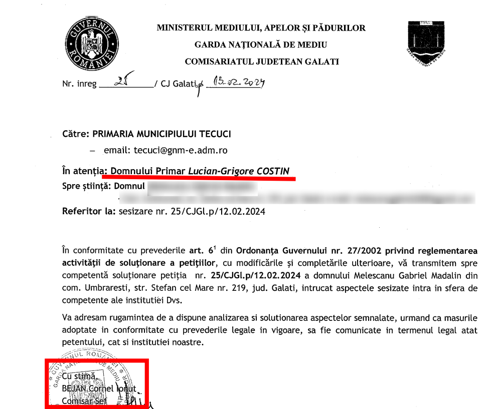 Directorul Gărzii de Mediu Galați pare să favorizeze Primăria Tecuci. Această constatare nu provine de la noi, ci de la cetățenii din Tecuci. De când Ionuț Bejan, membru al PNL și fost director al Poliției Locale Tecuci, a devenit director al Comisariatului Județean, comisarii Gărzii de Mediu Galați par să asculte orbește cererile directorului actual.