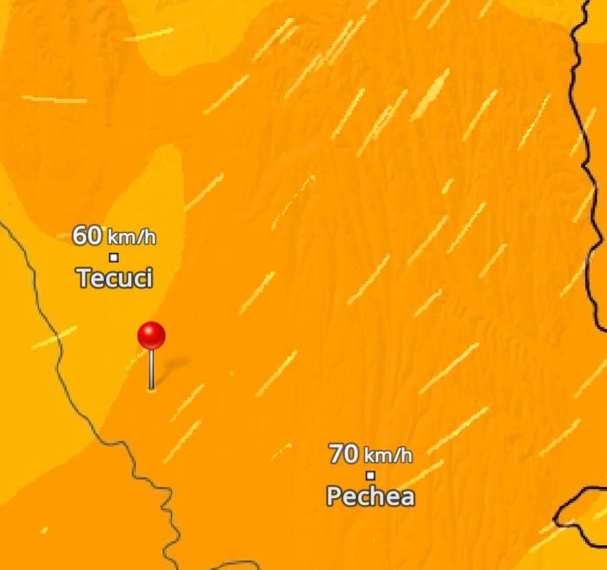 Mai sus aveți zonele vizate de vântul puternic, iar mai jos aveți harta vitezei vântului în județul Galați.