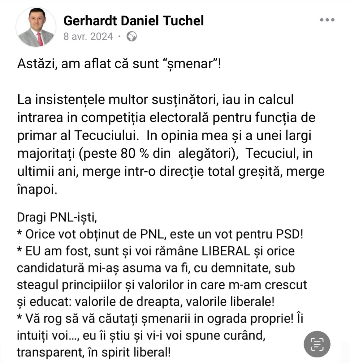 La începutul lunii aprilie, o postare a lui Daniel ȚUCHEL a atras atenția în mediul online, acesta anunțând o posibilă candidatură la Primăria Tecuci, pe pagina de Facebook.